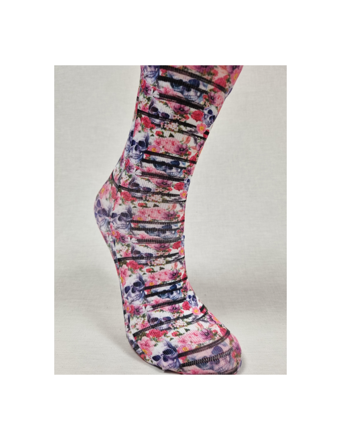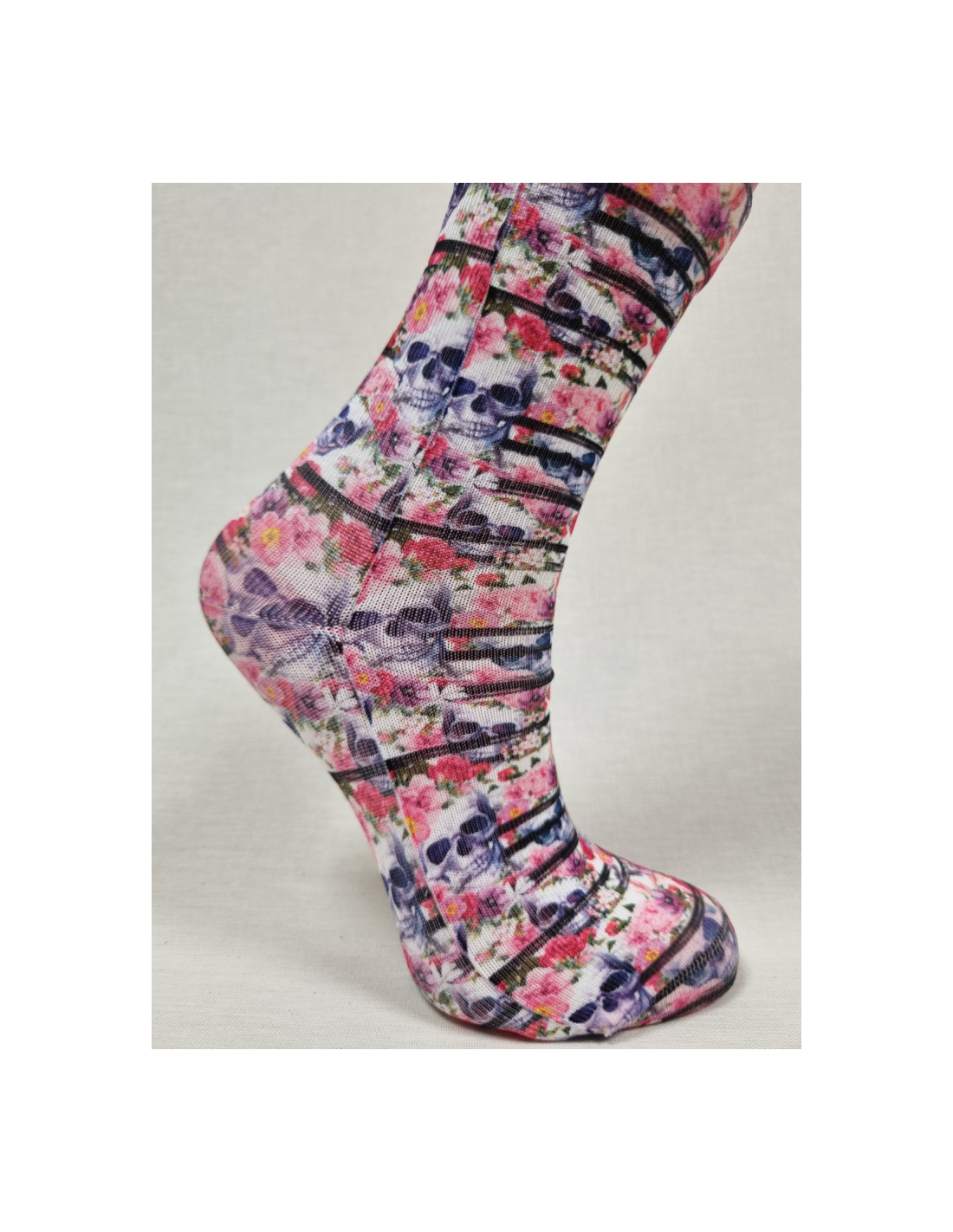 Originales calcetines de mujer con CALAVERAS y ROSAS.Espectacular diseño en estos calcetines súper cómodos.Colorido espectacular que hace de estos calcetines sin costuras un must have it.Imprecimdible en tus looks mas atrevidos. ¿Te atreves?Algodón en el interior del calcetin al contacto con tu piel.Talla unica: 37/41